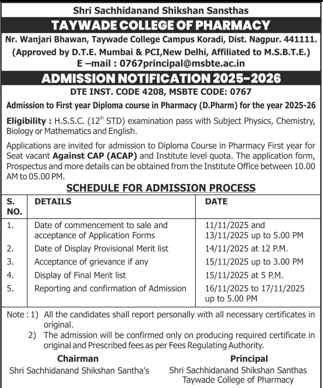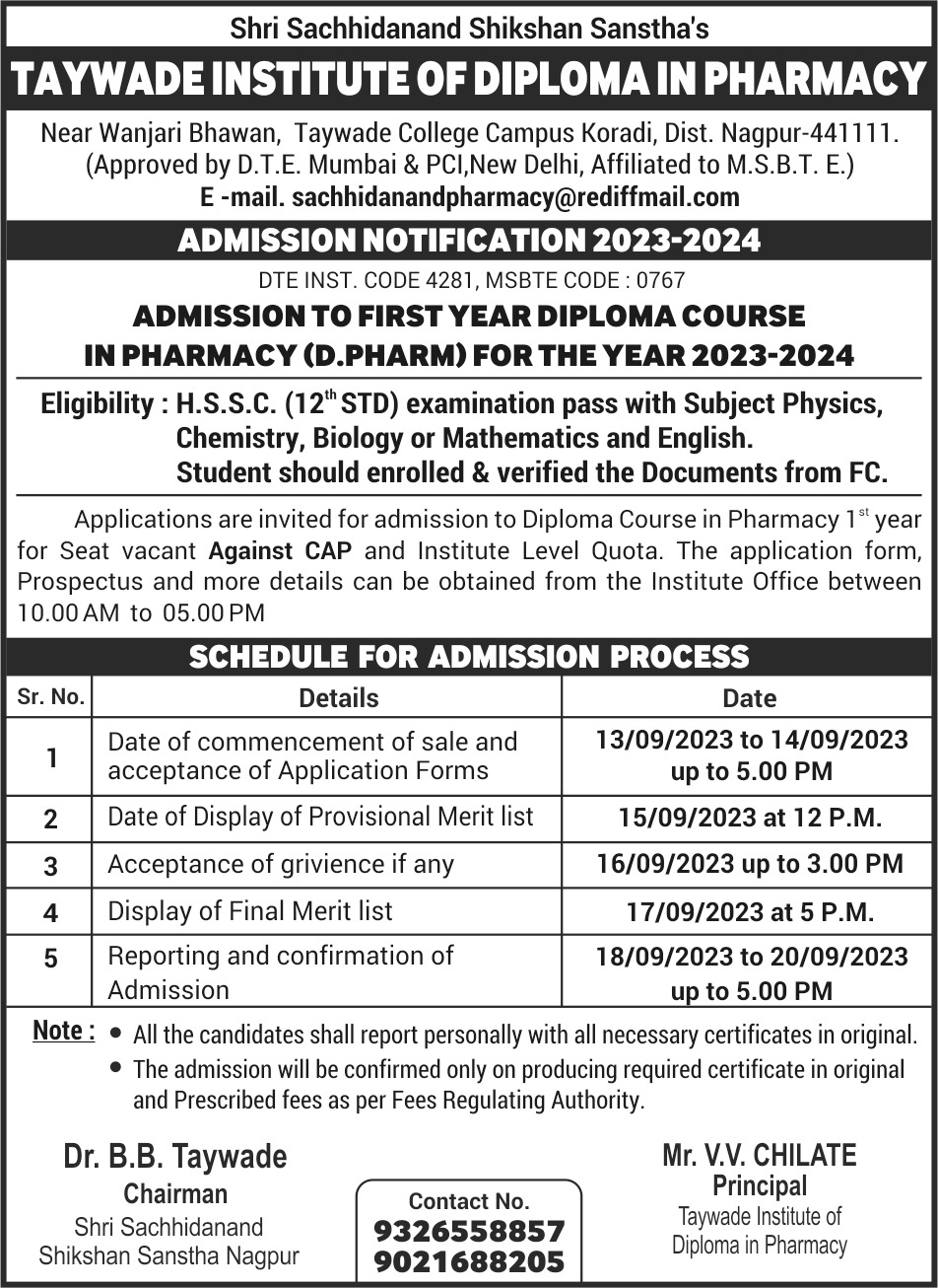 Education is the key to creating, adapting and spreading knowledge in all the disciplines and subjects. Keeping these objectives in mind, under the aegis of SHRI SACHHIDANAND SHIKSHAN SANSTHA, Taywade Institute of Diploma in Pharmacy was established in the year of 2006. The college is situated on 12 acres of land away from the hustle & bustle of busy city traffic, in the peaceful area of koradi which is very well near the Nagpur city.